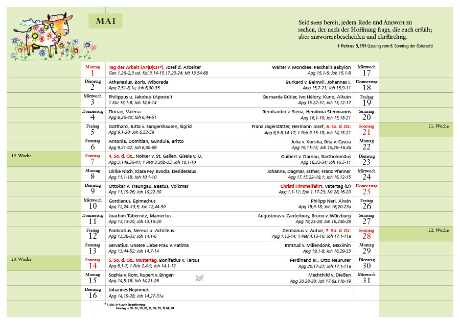 • ausführliches Monatskalendarium mit Namenstagen, Tageslesungen und Platz für Notizen