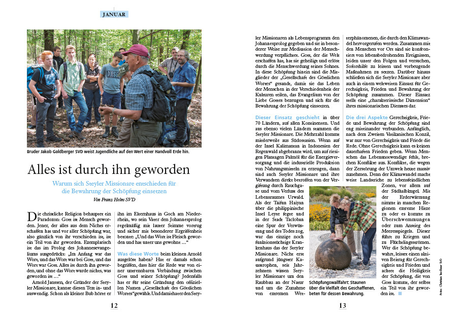 Diesem Auftrag sind die Steyler Missionare seit Jahrzehnten verpflichtet. Ihre pastorale und soziale Arbeit in allen Teilen der Welt bestätigt: Bewahrung der Schöpfung ist eng verbunden mit sozialer Gerechtigkeit und Frieden.
