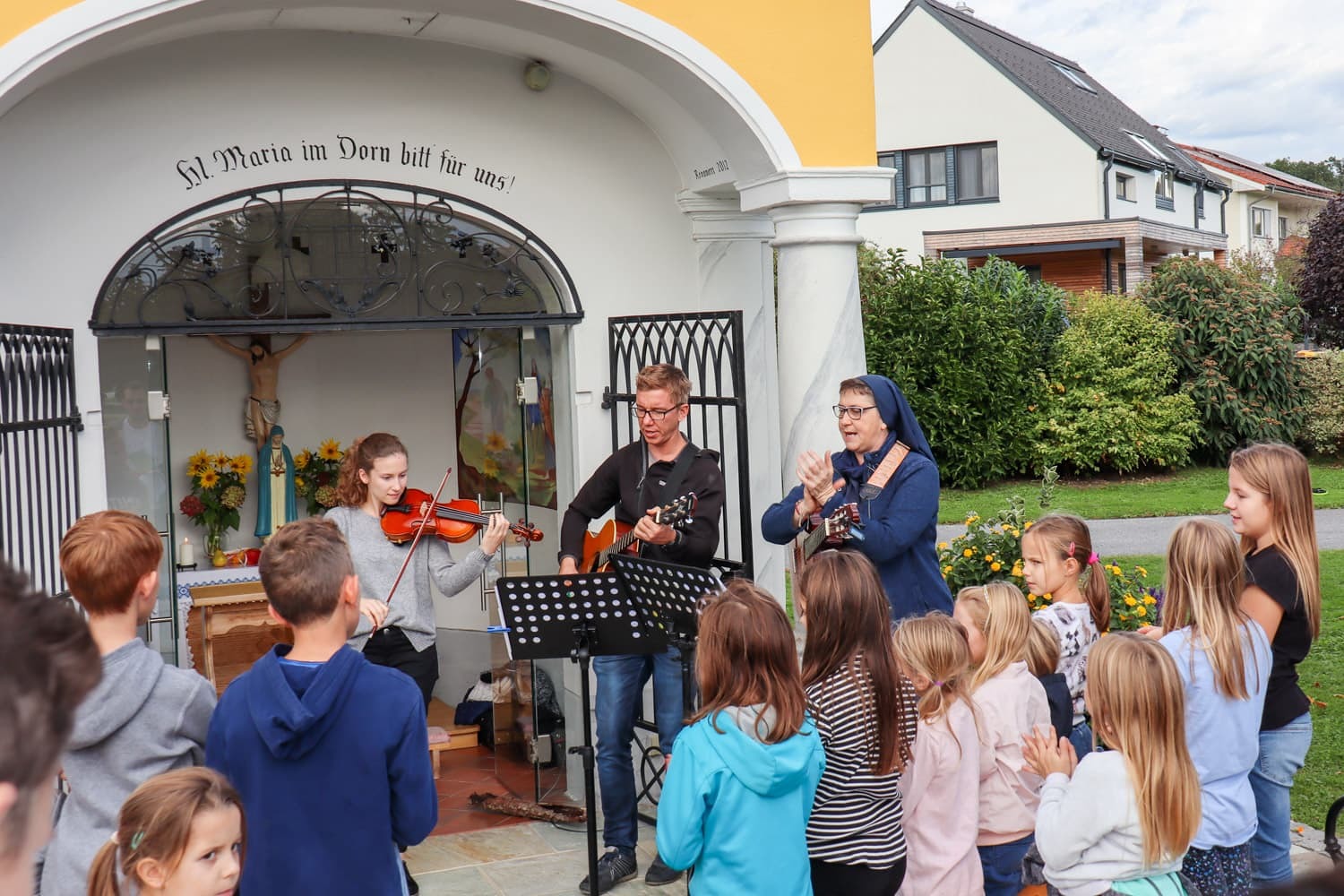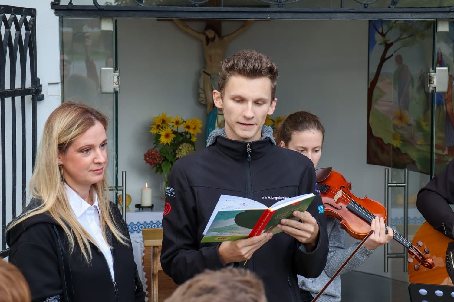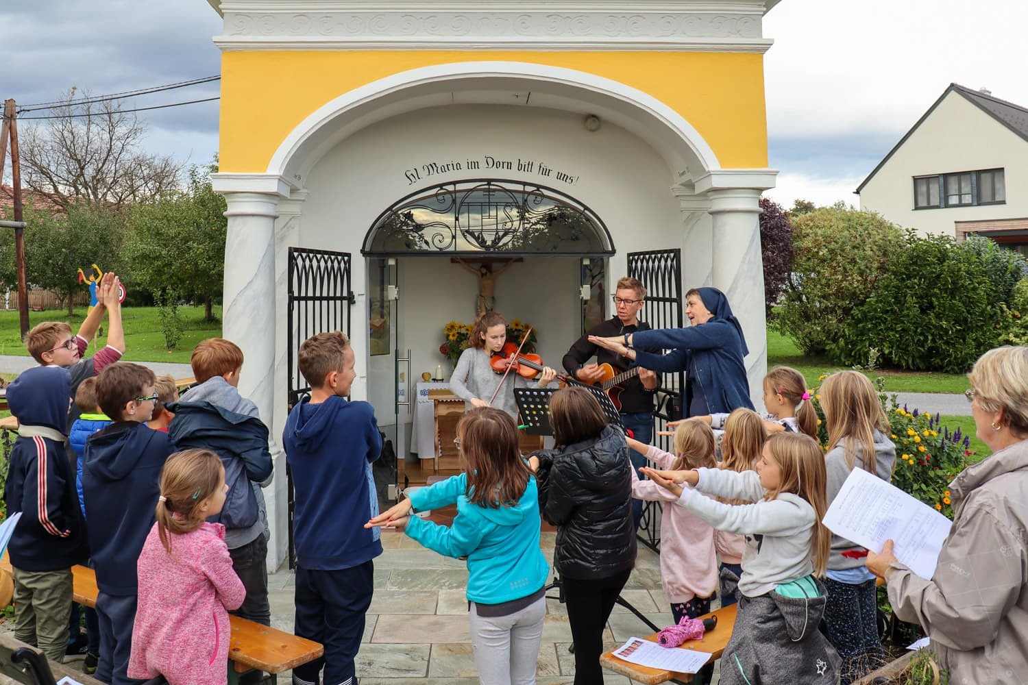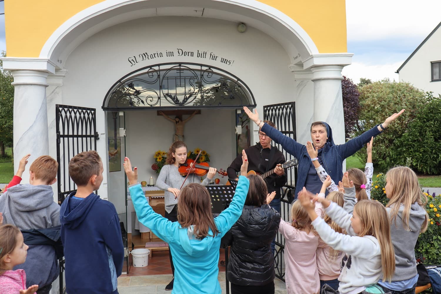 Die Familienwallfahrt führte diesmal von der Pfarrkirche nach Dobl-Dorf – aber nicht direkt. Mit einigen Stationen führte der Weg über den Oberberg durch den Kaiserwald nach Dobl-Dorf. Dort feierten wir dann eine Wortgottesfeier, nach welcher wir noch auf eine Jause eingeladen wurden.