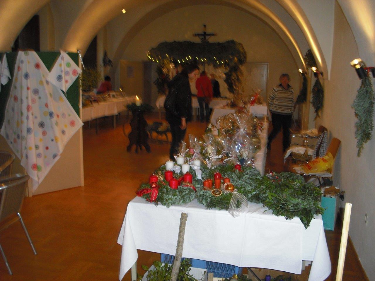Zum Verkauf werden unter anderem Adventkränze, Adventgestecke, Weihnachtsbilletts, Basteleien, Lebkuchen, Lebkuchenhäuser, Mehlspeisen, hausgemachte Kekse, Krippen, Sterne, Tischdecken, Schürzen, Socken und Hausschuhe angeboten.