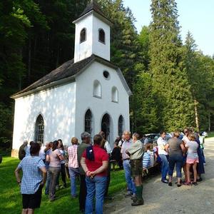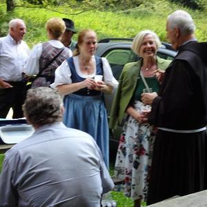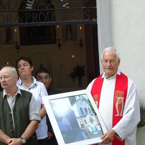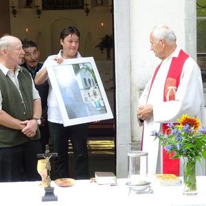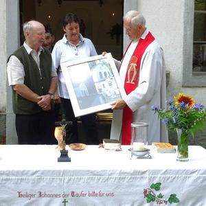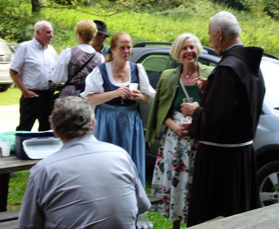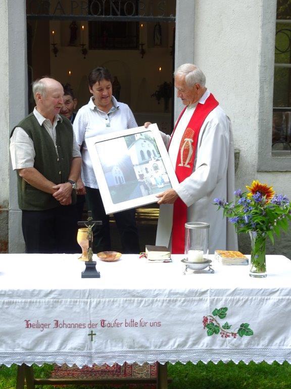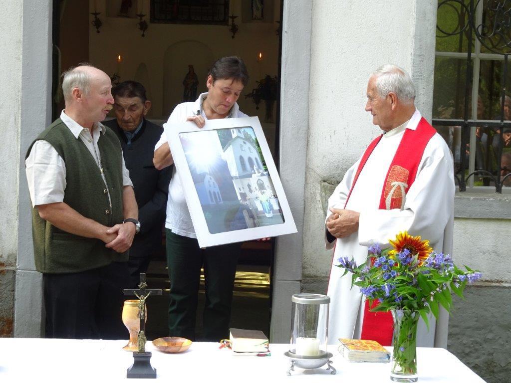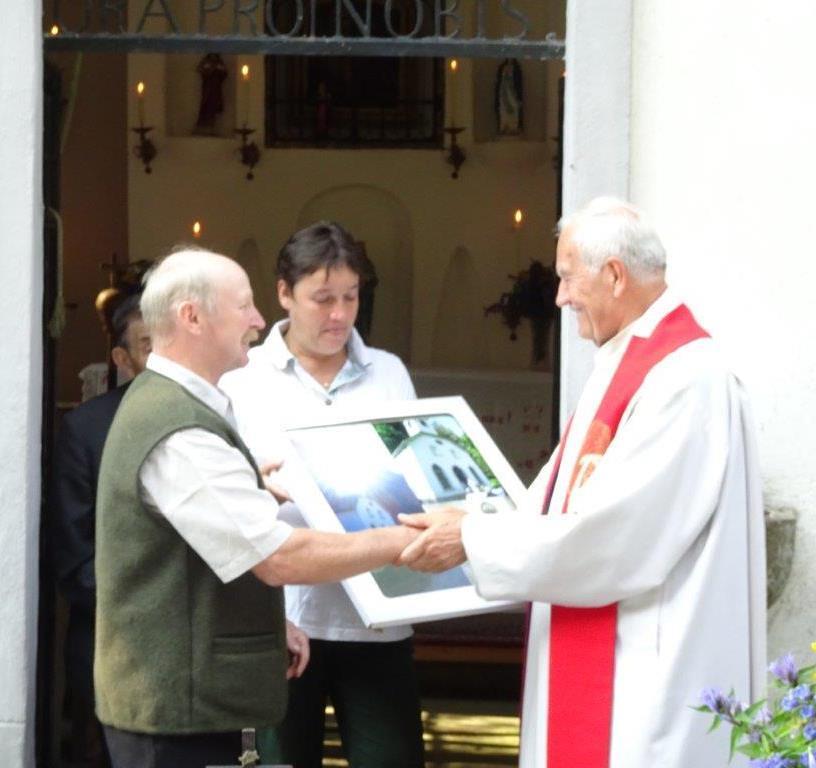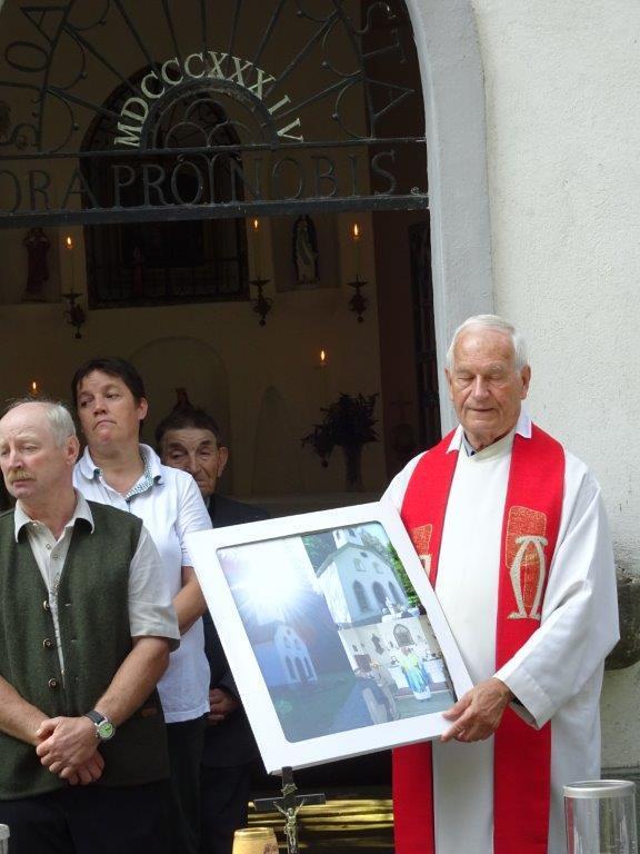 Am Festtag des heiligen Bartholomäus, einem der 12 Apostel, zelebrierte Pater Simon am 24. August 2018 um 9.00 Uhr bei herrlichem Wetter die letzte der vier Messe im Jahreskreis bei der festlich geschmückten Kapelle Jordankreuz im Pöllagraben vor 98 Gläubigen. Der Gottesdienst wurde wunderbar vom weiblichen Viergesang der Familie Plienegger vulgo Troll musikalisch umrahmt. Im Anschluss daran wurde von der sorgsamen Kapellenbetreuer-Familie Gabriela & Josef Fuchs vulgo Leeb in der Pölla Pater Simon zum Abschied und Dank ein wunderschönes Bild von der Kapelle zur lieben Erinnerung überreicht.