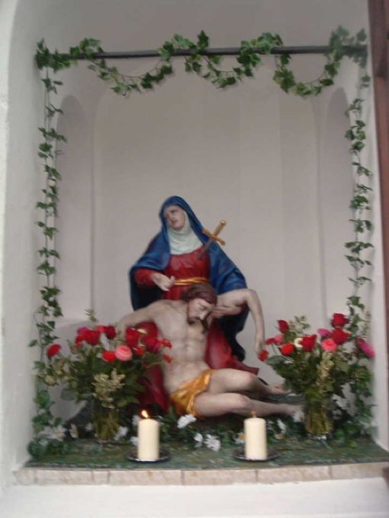Eines der wohl ältesten Wegkreuze unseres Gemeindegebietes ist das Mariazeller-Kreuz neben dem Postamt und dem Rintpark. Es gibt leider keine Aufzeichnungen über das Erbauungsjahr und den seinerzeitigen Grund für die Errichtung. Das Mariazeller-Kreuz hieß einst St.-Oswald-Kreuz und endstand mit Sicherheit lange vor 1605, denn da wird erstmals urkundlich erwähnt, dass der Magistrat - dieser muss zur damaligen Zeit der Besitzer gewesen sein - das "St.-Oswald-Kreuz vor dem Bruckertor" renovieren ließ. Nach der Gründung des Servitenklosters soll das Wegkreuz der Schmerzensmutter geweiht und 1799 renoviert worden sein. Laut den Aufzeichnungen in der Chronik unseres Ortes ließ die Witwe des Fleischhackers Martin Schweinegger das Kreuz 1840 renovieren. Ob das Wegkreuz auch im Besitz der Familie Schweinegger war, ist leider nicht mehr eruierbar. Ab diesem Zeitpunkt hieß es Schweinegger-Kreuz. Seit wann das Wegkreuz “Mariazeller-Kreuz” heißt, ist leider nicht bekannt. Sicher ist nur, dass bei diesem Kreuz lange Zeit der Sammelpunkt für die Fußwallfahrt nach Mariazell war. Man ging früher nicht übers Gebirge, sondern den Flüssen im Tal entlang. Nach mündlicher Überlieferung wurde dies bis zum 1. Weltkrieg so gehandhabt. Interessant ist auch die Tatsache, dass früher die Verstorbenen aus dem Umland zum Mariazeller-Kreuz gebracht wurden, wo dann die Totenbeschau stattfand. Im Anschluss geleitete der Priester den Verstorbenen an der Kirche vorbei zum Friedhof. Erst nach der Beerdigung wurde die heilige Messe gefeiert.