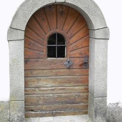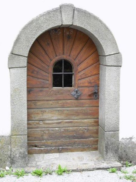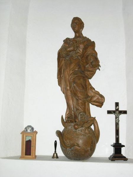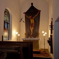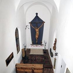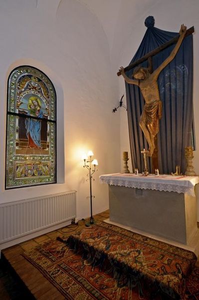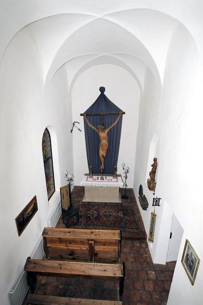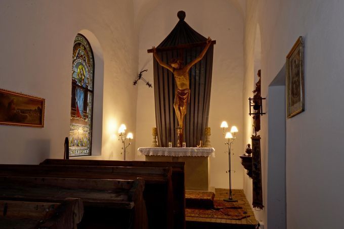 Die massive Eingangstür besteht aus Holz und hat in der Mitte ein kleines, geschütztes Glasfenster. Am Eingang befindet sich ein kunstvoll gestalteter Weihwasserkessel. Im Innenraum stehen sechs nicht sehr bequeme Betstühle aus altem Holz. Über dem Altar, vor einem dunklen Tuch, ist ein Kruzifix aus Holz aufgestellt, auf dem der gekreuzigte Christus mit seinem ausgemergelten Körper dargestellt wird. Obwohl dieses Kreuz bereits im 14. Jh. entstand, wirkt die Christusfigur ungemein modern und spiegelt die Botschaft des Karfreitags wider. Auf der rechten Seite kommt man durch eine schwere, schmiedeeiserne Tür in eine große Sakristei.