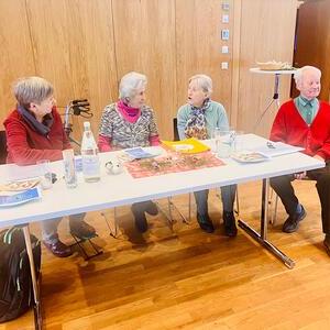 Bei einem Gläschen Wein, Kaffee und hausgemachten Mehl­spei­sen wur­den dann auch einige alt­bekan­nte Lie­der ge­sun­gen. Regina Dietrich be­glei­te­te die Sänger:­innen auf der Gitarre und die mit­ge­brach­ten Texte ver­lei­te­ten die Gäste zum Mit­singen.