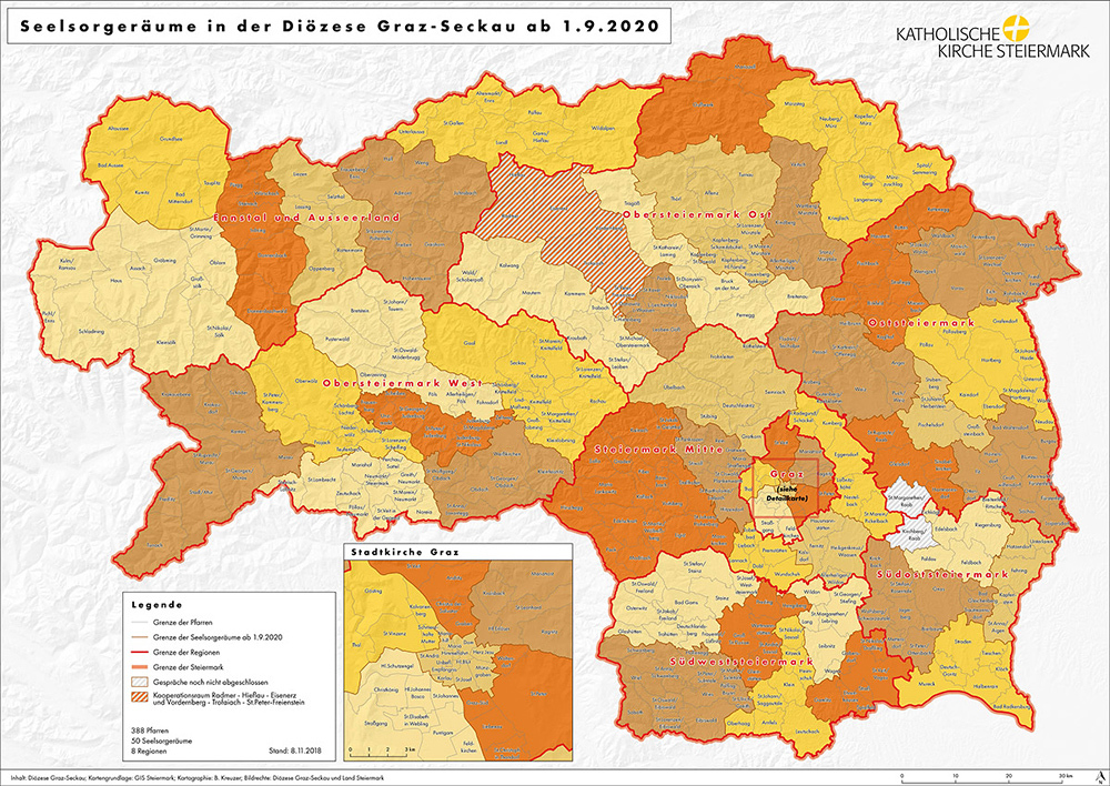 • Das Gebiet des neuen Bistums umfasste am Beginn lediglich 13 Pfarren und einen schmalen Streifen von Seckau über das Murtal und die Stubalpe in das Kainachtal und zur Mur bei Wildon.