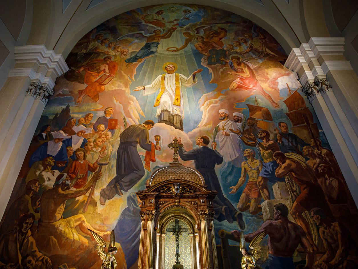 Zu Füßen des Hl. Vinzenz knien zwei Priester mit Palmzweigen in den Händen. Es sind zwei selige Lazaristen-Missionare, die in China den Märtyrertod am Kreuz gefunden haben: Franz Clet und Johann Gabriel Perboyre.