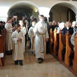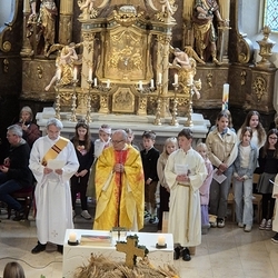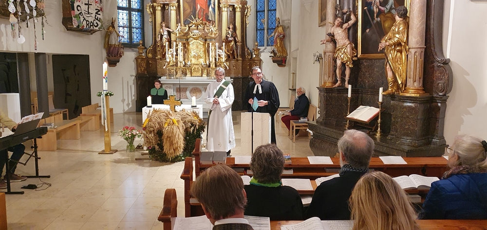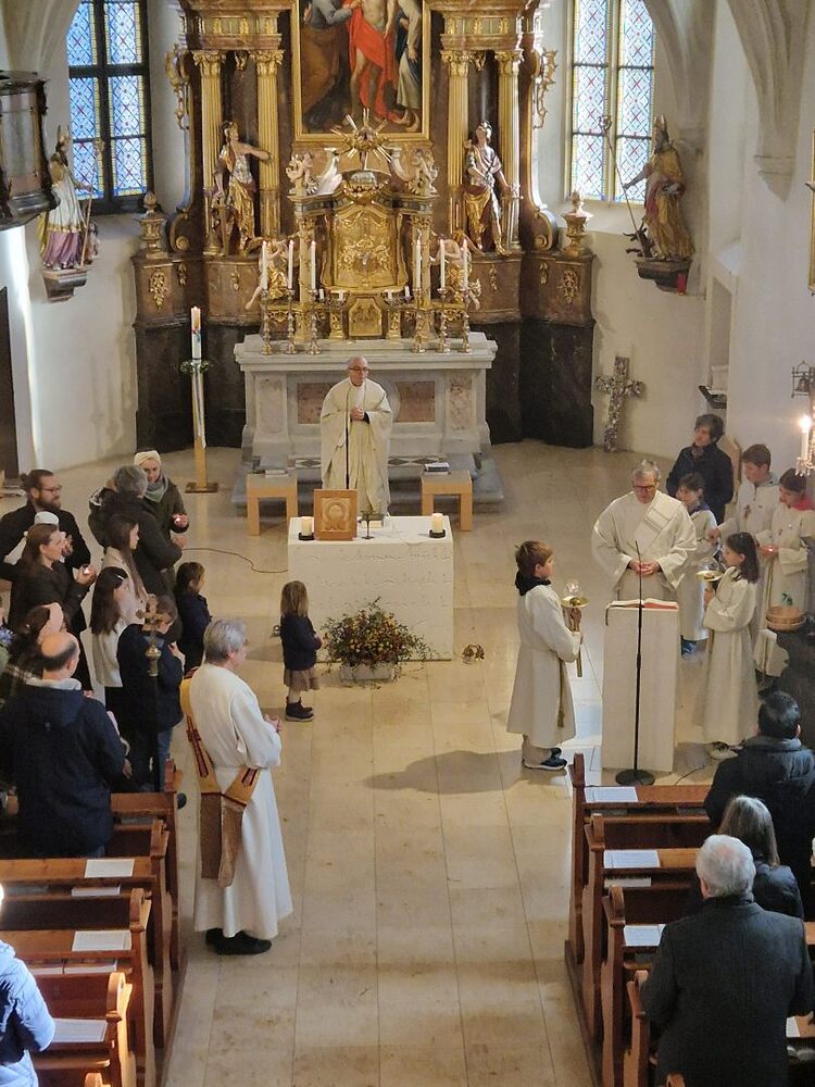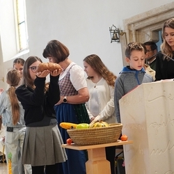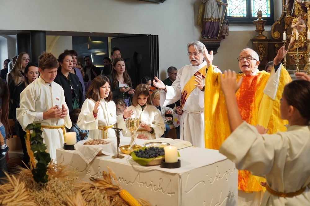 Voll Dankbarkeit und Freude feierten wir das diesjährige Erntedankfest in unserer mit großen und kleinen Leuten gut gefüllten Kirche. Vikar Norbert Glaser zelebrierte die heilige Messe, assistiert von Diakon Michi Zepf und sieben tüchtigen Minis.