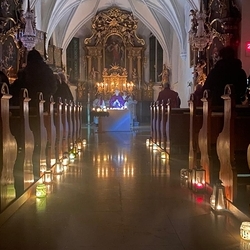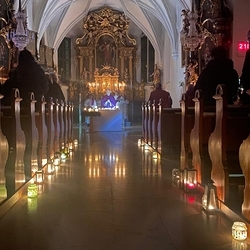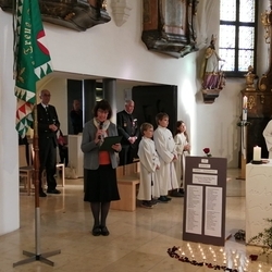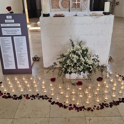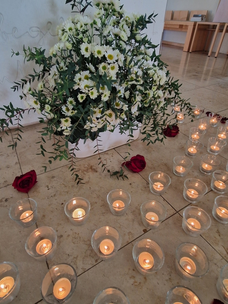 Vor dem Altar brannten 59 Teelichter für alle Menschen, die im letzten Jahr in unserer Pfarre verstorben sind. Ihre Namen wurden noch einmal laut ausgesprochen. Ein Teelicht leuchtete für alle Verstorbenen, die ungenannt blieben.