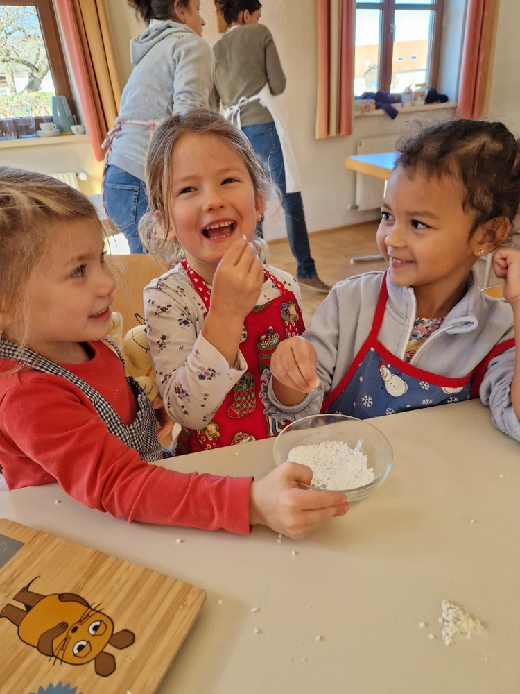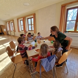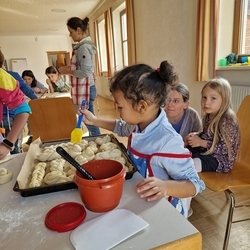 Dank Elena im Kindergarten Premstätten hatten sie neben dem Herd im Pfarrhof auch noch zwei weitere Herde in Verwendung, um die große Menge an geformten Teiglingen zu Köstlichkeiten zu verwandeln.