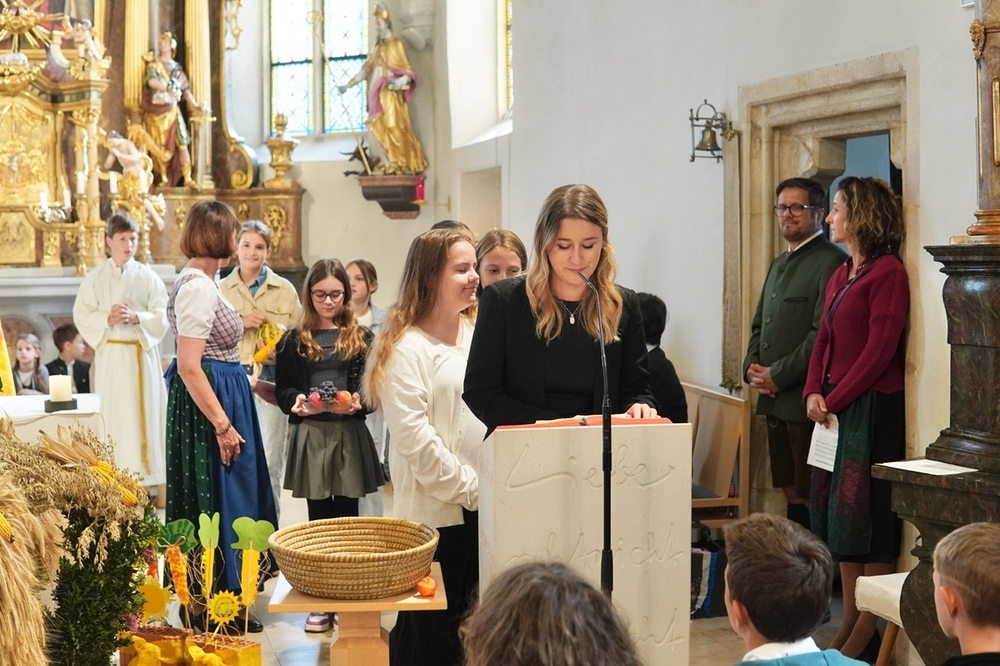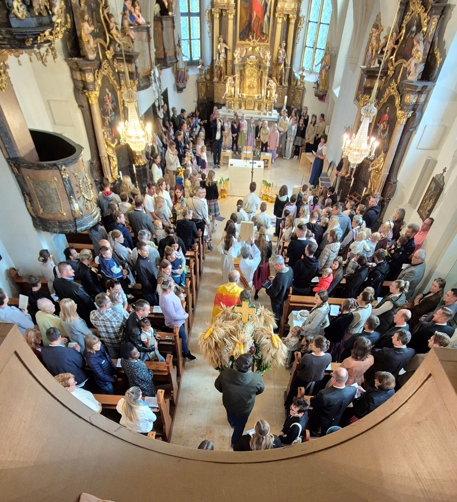 Nach dem feierlichen Einzug fand die Erntedankkrone, dieses liebevoll geschmückte Symbol reicher Ernte, vor dem Altar ihren Ehrenplatz. Danke der Landjugend Zettling für diese schöne Tradition!