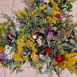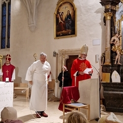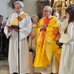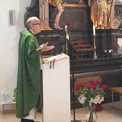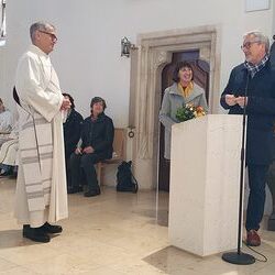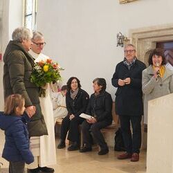 Vor dem Schlusssegen überreichte Ernst Pock im Namen der Pfarre dem neuen Diakon ein Aspergill, mit dem dieser gleich voll Freude die Gläubigen segnete. Für seine Ehefrau Eva, die ihm begleitend zur Seite steht, gab es einen Blumenstrauß, mit den besten Wünschen für sie.