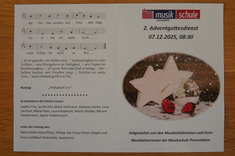 Die musikalische Gestaltung lag wieder in den Händen der Musikerinnen und Musiker der Musikschule Premstätten. Orgelmusik und Holzbläserensembles erfüllten die Kirche mit adventlichen Klängen und erfreuten alle Mitfeiernden.