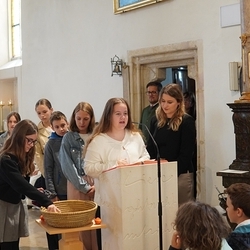 Gute Gedanken der MS-Schüler*innen regten beim Kyrie zum Nachdenken an – ein leerer Korb, der „Gott, sei Dank“ nicht leer bleibt! Ihre Fürbitten kamen aus eigener Feder und von Herzen.
